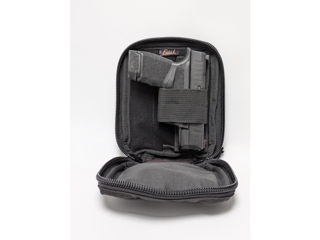 - Komora pro zbraň o vnitřním rozměru 17 x 13 x 3,5 cm s velur panelem, držákem zbraně a poutkem na Triggerguard